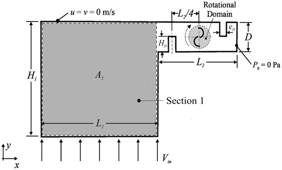 The schematic representation of the computational domain of the L-shaped channel geometry with the inserted turbine can be checked in Figure 1. The fluid flow is considered incompressible, turbulent, and in a two-dimensional domain. The depicted domain illustrates two deflectors, which is one of the three configurations studied here. For the other, the computational domain is the same, excepting the deflectors’ arrangement. The fluid flow is caused by the imposition of a constant velocity (Vin) at the lower surface of the channel (Section 1). In the study by Santos et al. [18], a simplified model combining a chamber and a Savonius turbine was analyzed. It was observed that using either a constant velocity profile or a sinusoidal profile resulted in similar behavior for transient and time-averaged power coefficients. Therefore, to reduce computational effort, this study considers only a constant velocity profile at the channel inlet. The imposed velocity varies for the different ratios of H1/L1 in such a way that the same mass flow rate is imposed for all geometric configurations. For H1/L1 = 1.0, Vin = 1.9 m/s, while the other configurations follow the relation Vin·L1 = 13.4040 m2/s. The imposed velocities guaranteed the same velocity of V1 = 7.0 m/s reaching the turbine duct. The imposed velocity for all cases will be shown in the geometric investigation section. The flow exits the computational domain by the turbine duct, where atmospheric pressure is imposed, i.e., a gauge pressure of Pg = 0 atm. In the rotational zone, the light-gray region near the turbine in Figure 1, a constant rotational velocity (ω′) is imposed, and the turbine walls have a no-slip and impermeability boundary condition in comparison with the rotational zone. In every simulation, the turbine rotor tip speed ratio is λ = ω′D/(2V1) = 1.5, and the constant rotor angular velocity is ω′ = 15.5 rad/s. The angular velocity used here is the same as that previously employed in the work of Santos et al. [31], who made some test simulations observing enclosed domains at a displacement of the peak of Cp for higher magnitudes of λ, in comparison with the free Savonius turbine configuration. For all remaining walls, a no-slip and impermeable (u = v = 0 m/s) boundary condition is applied. As initial conditions, it is considered a previous simulation at the steady state with the static turbine, which conducts to velocities of the order of Vin at the inlet region of the channel and L1·Vin/D in the region of the channel where the turbine is placed.