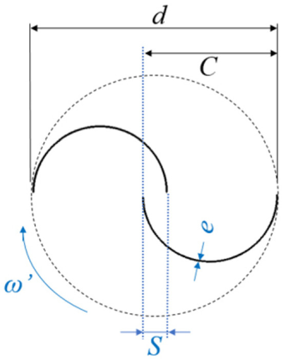 The dimensions adopted are L2 = 6.0 m, HD = 1.0 m, eD = 0.2 m, D = 2.0 m, and fourteen different magnitudes of H1 and L1 due to the variation of H1/L1 ratio in the range 0.2 ≤ H1/L1 ≤ 1.8. The same magnitudes of HD and eD are used for the case with two deflectors. The deflectors are placed at L2/4 from the center of the Savonius rotor. The positions of the deflectors are defined in such a way that the flow is intensified toward the advance blade. Moreover, the turbine is placed in the exit duct center, L2/2, and is considered to have a diameter of d = 1.8 m. The blades have a thickness of e = 0.0072 m and an overlap of S = 0.144 m, and their chord size is C = 0.972 m, as illustrated in Figure 2.