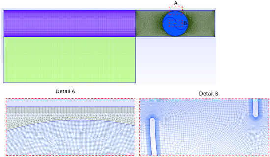 Figure 4 illustrates the mesh generated in the domain and the details A and B with more refined discretization near the walls of the turbine and the lateral surfaces of the channel for a configuration without deflectors. It is constructed in a region near the blades where rectangular finite volumes are inserted. Concerning the interface between the rotational and static regions, it is considered a sliding mesh, which is a special case of prescribed dynamic mesh motion, where the nodes move rigidly in the dynamic mesh zone (rotational region of the domain). Moreover, multiple cell zones are connected to each other through non-conformal interfaces. As the mesh motion is updated in time, the interfaces are updated to reflect the new positions of each zone.