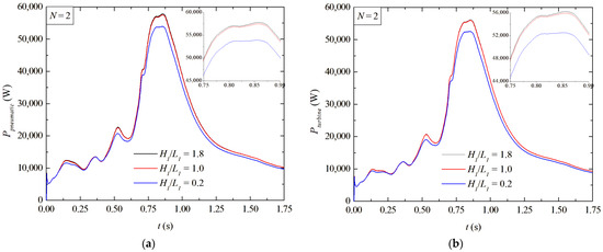 Figure 6 shows the instantaneous available power in the problem and the mechanical power in the turbine for three different magnitudes of H1/L1 = 0.2, 1.0, and 1.8 when two deflectors (N = 2) are mounted in the turbine duct. In general, it can be observed that the Ppneumatic (Figure 6a) and Pturbine (Figure 6b), as a function of time, are similar regardless of the ratio of H1/L1 for N = 2. The only difference is a slight decrease in the magnitude of Ppneumatic and Pturbine for the case with H1/L1 = 0.2. The results also demonstrated that Pturbine is similar to Ppneumatic, with a general magnitude inferior to Ppneumatic.