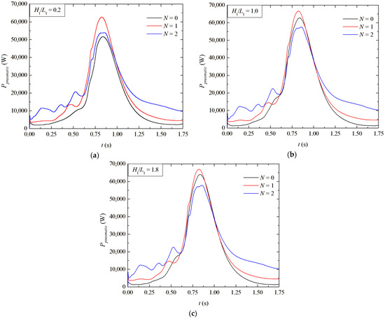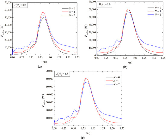 Figure 8a–c depicts the instantaneous Pturbine for three different ratios of H1/L1 = 0.2, 1.0, and 1.8, similar to that shown in Figure 7 for Ppneumatic. The observations reached for Pturbine are like those noticed for Ppneumatic, with the difference in the magnitudes of Pturbine, which are lower than that reached for Ppneumatic. For H1/L1 = 0.2 (Figure 8a) it seems clear that the inclusion of the deflectors benefited the Pturbine in all instants of time. For H1/L1 = 1.0 and 1.8 (Figure 8b,c) the performances of N = 0 and 1 are quite similar, while N = 2 led to the lowest peak but the best performance outside the peak regions. To define the best configuration in this situation, it is necessary to calculate the mean turbine power during all of the simulated time intervals. This can be observed when the performance for the different N is compared for different instances of time. For instance, for H1/L1 = 0.18 and t = 0.125 s, when N = 2 is Pturbine = 9.66 kW, while for N = 1 and N = 0, it is obtained that Pturbine = 3.74 kW and Pturbine = 0.82 kW, respectively. For the same case, the peak is Pturbine = 60.48 kW, 61.05 kW, and 56.27 kW for N = 0, 1, and 2, respectively.