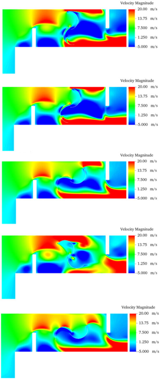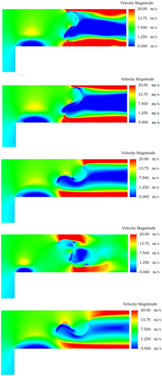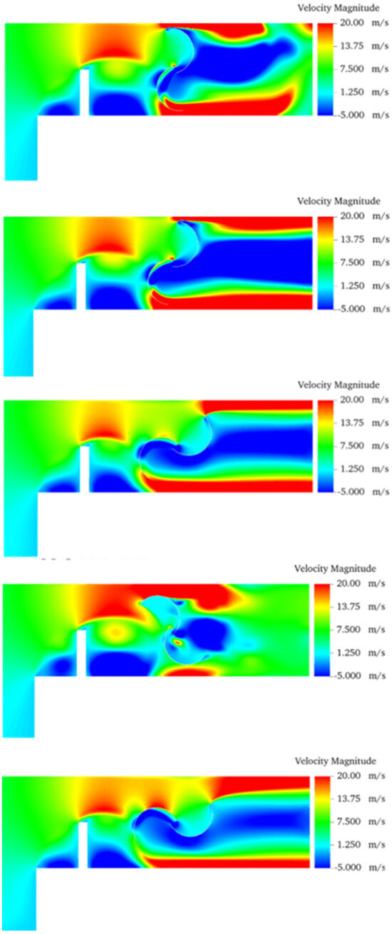 The qualitative behavior of transient flow in the turbine duct for the cases with N = 0, 1, and 2 are illustrated in Figure 9, Figure 10 and Figure 11, respectively. Precisely, it shows the velocity fields for different instants of time during one rotation of the turbine for the three different configurations when H1/L1 = 1.0. It is worth noting that the behavior is similar for the other ratios of H1/L1. Therefore, for the sake of brevity, only one configuration of H1/L1 is presented. The results of Figure 9 indicate a vortex generation in the corner that connects the two channels that define the L-shaped channel. In this sense, the increase in momentum remains restricted above the vortex and far above the advance blade. Figure 9 also depicts high magnitudes of velocity in the gap between the tips of the blades and the duct surfaces.