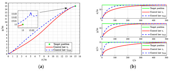 Case 1: Choose b(0) = [0, 0, 0]T, = diag(5 × 103, 5 × 103, 5 × 104), = diag(103, 103, 103). Set desired position and heading for FOP as = [15 m, 15 m, 10°]T, and the initial states are η(0) = [0 m, 0 m, 0°]T, ν(0) = [0 m/s, 0 m/s, 0°/s]T, w(0) = [0, 0, 0]T, δ(0) = [0.1, 0.1, 0.1]T. The controller design parameters are ρ = [5 × 10−3, 5 × 10−3, 1 × 10−4]T, = diag(2, 2, 2), = diag(1.5, 1.5, 1.5), = diag(3 × 105, 6 × 105, 3 × 108), = diag(20, 20, 20), = 0.8, = 10−6 × diag(1, 1, 10−4), = 104 × diag(1, 1, 3 × 103).