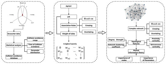 The objective of this study is to explore the correlation among CABFPS and to investigate the influence mechanism of factors on ship collision avoidance behavior under different encounter situations. The research framework primarily encompasses four processes: extracting the sample sets of collision-avoidance behavior in different encounter situations from AIS data, mining association rules between CABFPS, constructing complex networks and analyzing collision-avoidance-behavior characteristics. Firstly, ship-collision-avoidance-behavior data are extracted from AIS, based on the changes in heading and speed of ships during actual navigation. Secondly, the distribution of CABFPS is visually displayed, based on the extracted collision-avoidance data, thereby establishing CABFPS database. Then, association rules between the CABFPS under different encounter situations are mined, and the results of the association-rule mining are used to determine the network nodes and the connections between nodes to establish a complex network model. Finally, by analyzing the network topology and important nodes, the key parameters affecting ship collision-avoidance behavior under different encounter situations are identified. The research framework is shown in Figure 1.