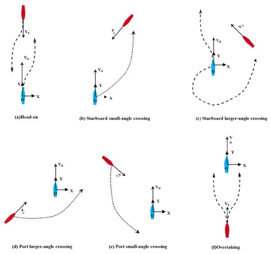 Ship collision avoidance action.(a) head-on; (b) starboard small-angle crossing; (c) starboard larger-angle crossing; (d) port larger-angle crossing; (e) port small-angle crossing; (f) overtaking.