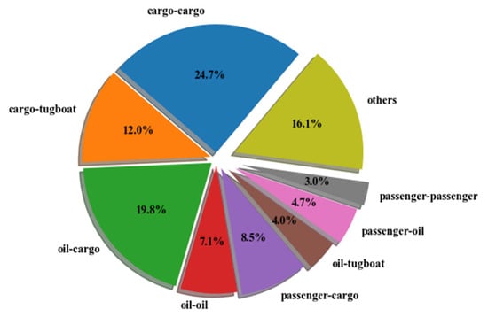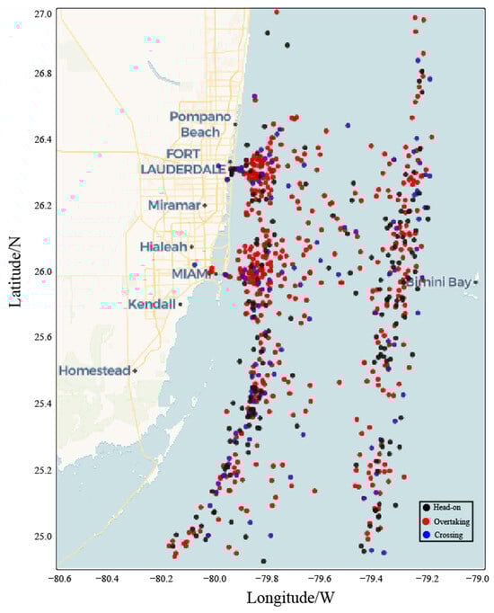 The water area with a longitude range of (079.4° W, 080.3° W) and a latitude range of (24.8° N, 27.0° N) was selected as the research area. This area is an important shipping channel and tourist destination, with a high density of shipping traffic and a complex navigation environment. There are large number of encounter situations, with near-missing and collision-avoidance behaviors occuring in the area, and therefore sufficient sample data can be obtained for the feature analysis of collision avoidance behavior. Following the research framework shown in Figure 1, the research subjects selected are all ships equipped with AIS and from which we extracted 771 encounter data; the process of extracting collision avoidance behavior is detailed in References [,]. The distribution of the encounter sample data is shown in Figure 5, and the types of encounter ships in the sample are shown in Figure 6. Among them, there are 482 crossing situations, accounting for 62.52% of the total encounter samples, 118 overtaking situations, accounting for 15.3% of the total samples and 171 headon situations, accounting for 22.18% of the total samples. Figure 6 shows that, among the extracted encounter samples, the proportion of encounters between cargo ships is the highest, with encounters between cargo ships and oil ships accounting for more than half of the total encounters, while the encounters between passenger ships are the lowest.