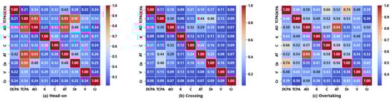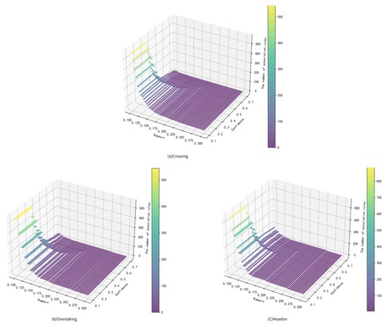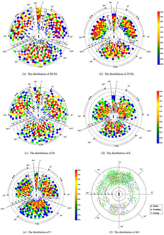An analysis of the statistical characteristics of CABFPS when ships take collision avoidance actions under different encounter situations is conducted, as shown in Figure 7, where blocks closer to red in the figure represents higher frequencies of feature parameters within that range.