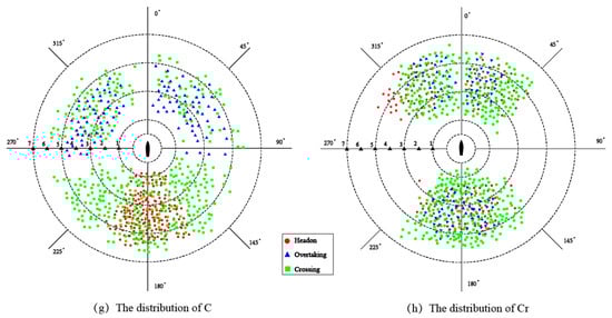 Distribution of characteristic parameters of collision-avoidance behavior under different encounter situations. (a) DCPA; (b) TCPA; (c) Dr; (d) K; (e) V; (f) AO; (g) C; (h) Cr.