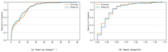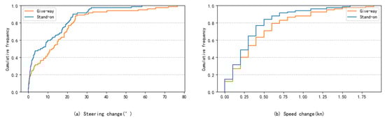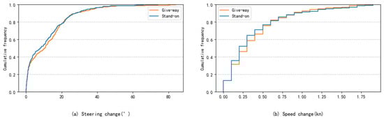 Figure 8, Figure 9 and Figure 10 show that ships’ steering amplitude during the collision-avoidance process is relatively small. Specifically, in head-on situations, approximately 61% of give-way ships and 72% of stand-on ships have a steering amplitude less than 20°, with only 14% of give-way ships and 11% of stand-on ships having a steering amplitude greater than 30°. In crossing situations, about 70% of give-way ships and 63% of stand-on ships have a steering amplitude less than 20°, with only 12% of give-way ships and 8% of stand-on ships having a steering amplitude greater than 30°. In overtaking situations, about 77% of give-way ships and 70% of stand-on ships have a steering amplitude less than 20°, with only 10% of give-way ships and 9% of stand-on ships having a steering amplitude greater than 30°. The overall speed-change amplitude of ships is extremely small, with 80% to 95% of ships having a speed change of less than 1 kn across various encounter situations. This is primarily because the effectiveness of speed changes in collision avoidance is far less ideal compared to steering changes, and hence the actions of ships taking speed changes for collision avoidance is not significant.