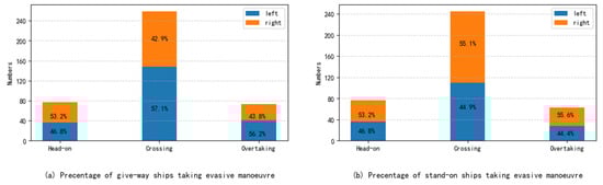 As shown in Figure 11, in head-on situations, although the COLREGS mandate that ships should turn to starboard, as shown in Figure 12a, more than 45% of ships have been observed to take a port turn measure. This primarily because when two ships are in head-on situation and are positioned on the starboard side of the oncoming ship, if both ships take a starboard turn, it is highly likely to increase the risk of collision. Therefore, in such situations, each ship should appropriately turn to port to increase the lateral distance between them, thereby accomplishing collision avoidance, as shown in Figure 12b. In overtaking situations, the give-way ships tend to turn left while the stand-on ships tend to turn right. In actual scenarios, overtaking from the port side of the overtaken ships (stand-on ships) is safer than overtaking from the starboard side. Thus, the overtaking ships (give-way ships) should prioritize turning left, and the overtaken ship (stand-on ships) should prioritize turning right to facilitate the overtaking ships (give-way ships) to pass on the port side; in crossing situations, there is a significant difference in the steering actions taken by give-way and stand-on ships, with the proportion of give-way ships turning left being as high as 57.1%, while the proportion of stand-on ships turning left is only 44.9%.