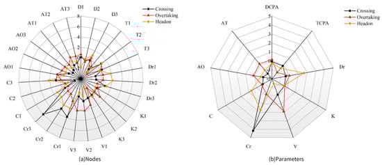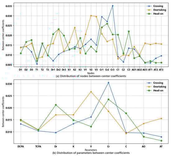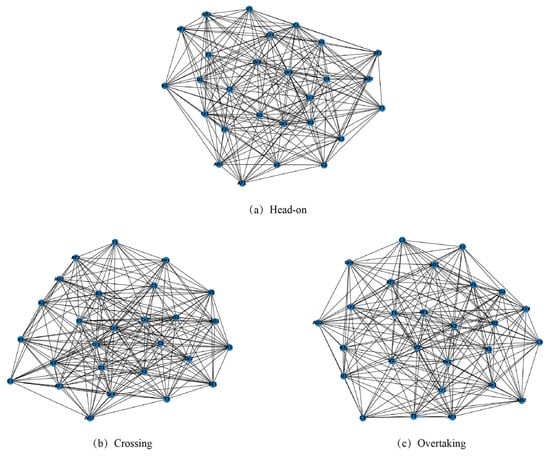 Based on the weighted adjacency matrix W, the collision avoidance parameters networks can be constructed. After establishing the network, the selection of topological metrics is also crucial. These metrics reflect the characteristics of the network nodes and their connections []. By combining the actual collision avoidance behavior of ships and the connections between parameters, the following metrics are selected to analyze the network characteristics.