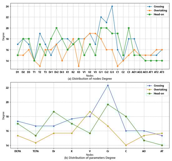 Node degree refers to the number of edges connected to nodes, in the context of collision avoidance parameters networks, a higher node degree implies a greater frequency of occurrence for the corresponding parameter within its respective range. The calculation is as follows:
