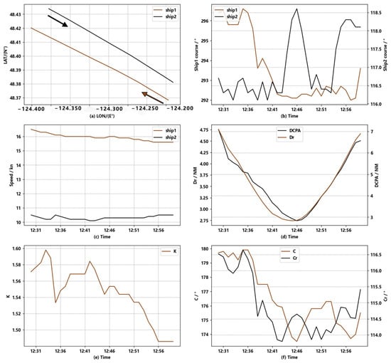 The Automatic Identification System (AIS) is not only a primary device for ships to understand the intentions of other ships, but also an essential technological tool for maritime regulatory authorities to track and supervise ships. It has widespread applications in the fields of ship behavior analysis, ship-collision risk assessment, and ship collision avoidance decision-making. The emergence of AIS data has greatly enriched the information sources for ship collision-avoidance behavior research, encompassing a vast library of ship navigation information, providing valuable data support for researchers. Zhang et al. proposed a method for detecting near miss from AIS data, applying ship domain, relative distance, relative speed and relative bearing, to construct a Ship Conflict Risk Ordering (VCRO) model to determine the risk level of near-miss scenarios. To better assess the collision risk between ships, the VCRO model was further improved by considering ship dimensions and minimum distance to collision (MDTC), using VCRO to identify the risk of encounter situations and thus rank the collision risk of ships [,]. Gao et al. utilized the T-SNE algorithm to reduce the extracted 7-dimensional AIS data to 3 dimensions and visualize it, then applied spectral clustering algorithms to the reduced data for cluster analysis to reflect the objective laws of ship maneuvering behavior, thereby completing the identification of ship collision-avoidance-behavior patterns []. Yang et al. utilized the Fujii ship domain model to detect near miss scenarios, defined the duration of dangerous passages and average duration, and established a near missing collision time model. Subsequently, the proposed model was validated with AIS data from the Bohai Sea area, finding that the duration of near miss is related to ship type and scale []. Rong et al., based on the sliding window algorithm, considered relative distance, and turning rate and its derivatives to extract ship collision-avoidance behavior from AIS data, a method that can describe the spatial distribution of positions when taking collision-avoidance actions []. Hwang et al. collected AIS data from the West Sea of Korea for 12 months and used data-driven methods and clustering models to identify and classify ship collision avoidance behavior under various conditions, using the relative bearing between two ships to explain the navigational relationship []. Shu et al., through the analysis of AIS data from the Port of Rotterdam in the Netherlands, found that wind, visibility, currents and encounter situations significantly affect changes in ship speed and heading, indicating that ships adjust their speed, heading and relative distance from the approaching ships during encounters to take evasive actions []. Zhou et al. conducted an analysis of AIS data from the Port of Rotterdam in the Netherlands, along with collected meteorological and hydrological data. Performing a regression analysis on ships of similar scales, indicated that the influence of currents on ship speed is greater than wind, and the impact of wind on ship heading is greater than currents. Statistical analysis revealed that changes in ship headings during collision avoidance are a series of small-angle alterations, rather than direct turns []. Chen combined the weighted KNN and hyper-sphere support vector machines for classification decision-making of ship-encounter data, dividing it into seven collision-avoidance-process patterns. Based on the collision-avoidance knowledge obtained from training AIS data with HSSVM, a knowledge base for ship-collision-avoidance patterns was constructed using convolutional neural networks, and its application was demonstrated [].
