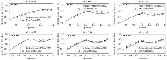 The reduced mechanism was validated against experimental ignition delay times (IDTs) for operating conditions representative of a diffusion combustion process (Figure 2 and Figure 3). The ignition delay time predictions were made by using a homogeneous batch reactor of constant volume with Cantera 2.6 [30]. In general, a good agreement between the reduced model and the experimental data are achieved.