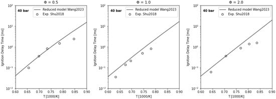 Ignition delay times of an ammonia-air mixture at 40 bar at different equivalence ratios. Comparison between the selected reduced kinetic mechanism from Wang et al. 2023 [29] and empirical data from shock tube experiments [33].