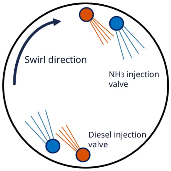 The two additional ammonia injection valves were modeled as depicted in Figure 5 on the cylinder cover, at a given distance from the diesel injection valves, which serve the purpose of initiating the combustion of ammonia and are, hereinafter, referred to as pilot injection valves.