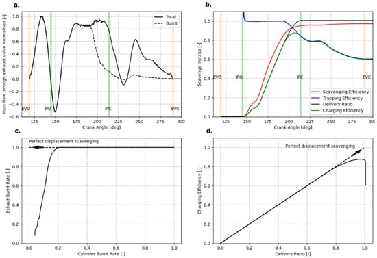 Normalized engine parameters characteristic of the gas exchange process at nominal engine operating conditions. (a) Gas mass flow through the exhaust valve. (b) Scavenging metrics. (c) Exhaust Burnt Rate vs. Cylinder Burnt Rate. (d) Charge Efficiency vs. Delivery Ratio.