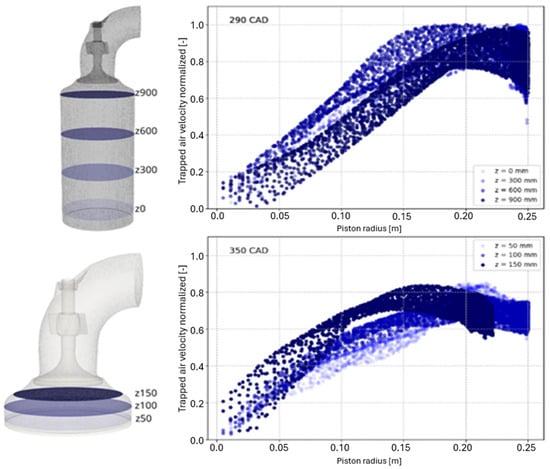 Normalized in-cylinder air velocity distribution in the radial direction at different heights. Top: 290 CAD. Bottom: 350 CAD.