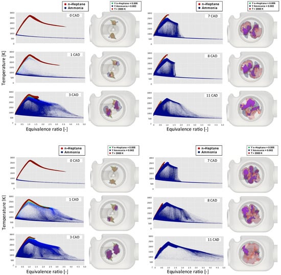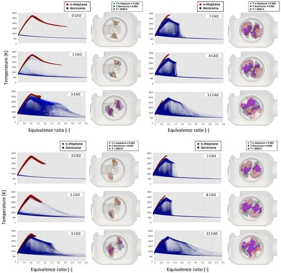 At t = 3 CAD, the diffusion combustion of ammonia is established. In this instant, the contact volume between n-heptane and ammonia, depicted in the combustion chamber in purple, is the smallest in Case B. This can be discerned in the Φ-T chart by the lower values of Φ under which ammonia burns, and may be attributed to the diesel pilot flame nearing extinguishment when the ammonia flame enters full diffusion combustion.