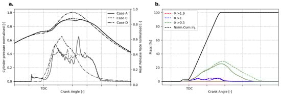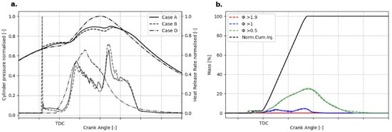 (a) Cylinder pressure and Heat Release Rate comparison between Case A, Case B, and Case D. (b) Mixture mass distribution at different equivalence ratios for Case A and Case B.