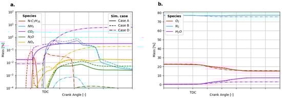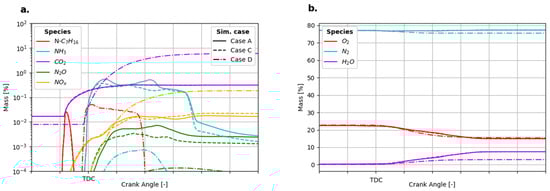Figure 10 depicts the evolution of various gas species during the combustion process. N-heptane and ammonia correspond to the pilot and main fuels in cases A and B, respectively. A comparison of the mass of ammonia in the cylinder reveals that the advancement of the pilot injection timing has a limited but non-negligible impact on ammonia combustion. This influence is consistent with the double-peak pattern observed in Figure 8 and Figure 9 and is also evident in the evolution of the ammonia mass in the cylinder.