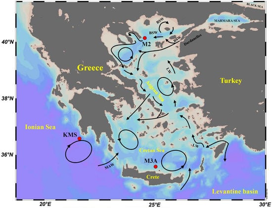 - Theocharis, A.; Balopoulos, E.; Kioroglou, S.; Kontoyiannis, H.; Iona, A. A synthesis of the circulation and hydrography of the South Aegean Sea and the Straits of the Cretan Arc (March 1994–January 1995). Prog. Oceanogr. 1999, 44, 469–509. [Google Scholar] [CrossRef]