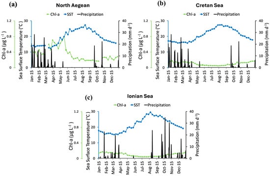 Environmental parameters of Chlorophyll-a (Chl-a), sea surface temperature (SST), and precipitation, concerning the study areas for the total study period; (a) North Aegean; (b) Cretan; and (c) Ionian Seas.