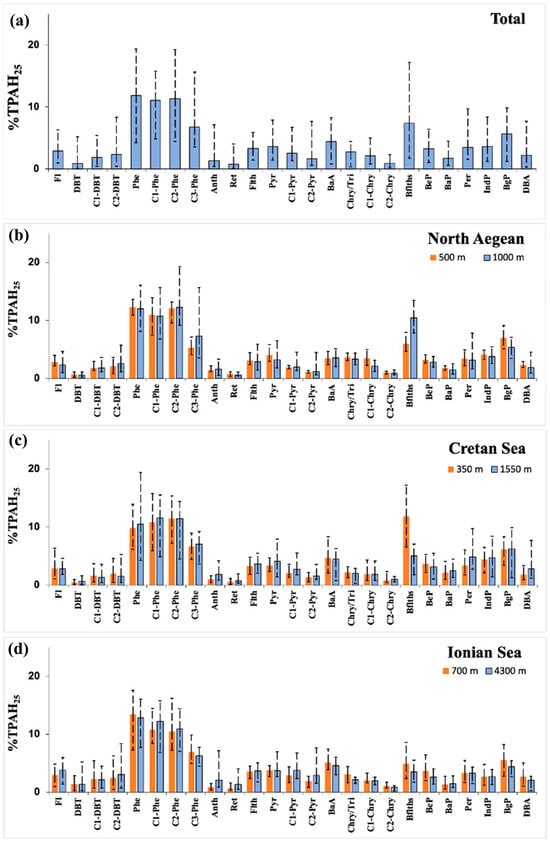 Molecular profiles of PAHs in sinking particles at the corresponding depths with mean abundances normalized as percentage of the total sum of PAHs monitored (%TPAH25) along with min-max deviation lines for the: (a) Total study area; (b) North Aegean; (c) Cretan; (d) Ionian Seas. For PAH abbreviations, see Section 3.2.