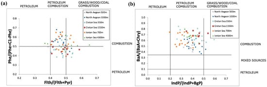 (a) The Phe/(Phe + C1-Phe) vs. Flth/(Flth + Pyr); (b) the BaA/(BaA + Chry) vs. IndP/(IndP + BgP) diagnostic ratios cross plots for the studied areas (north Aegean, Cretan, and Ionian Seas), along with values corresponding to specific PAH sources following Yunker et al. (2002) [15].