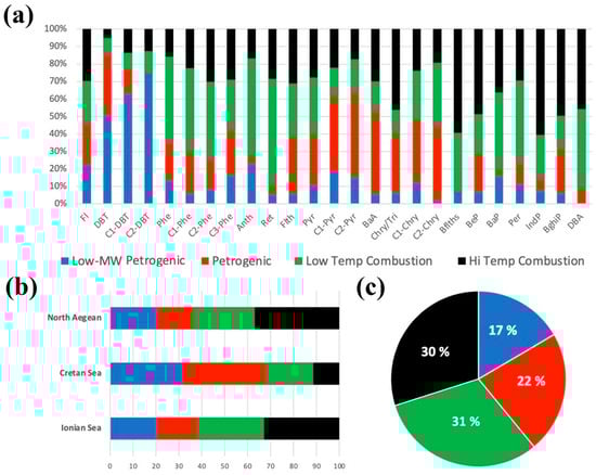 Upon examining the factor loadings at each location (Figure 5b), it is evident that the North Aegean and Ionian Seas have similar loadings across the factors, with low- and high-temperature combustion sources making an important contribution to the overall PAH levels (>60% in both cases). Interestingly, petrogenic/petroleum inputs are the most significant source at the Cretan Sea (~70%). This contribution could be likely attributed to several biogeochemical factors influencing the spatial variability of PAH fluxes in the studied areas, discussed in detail in Section 5.3 below.