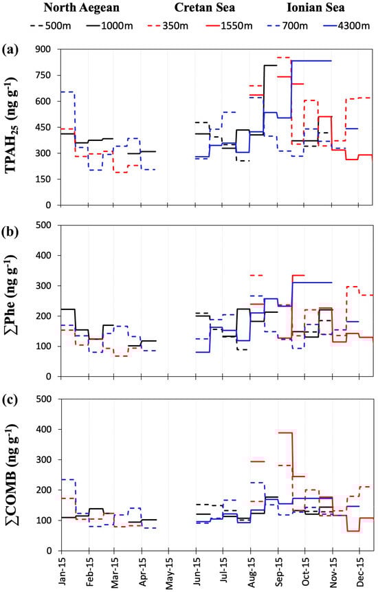 Time series of concentrations expressed in ng g−1 for (a) TPAH25; (b) ∑Phe; (c) ∑COMB determined at corresponding sampling depths for the total study period.