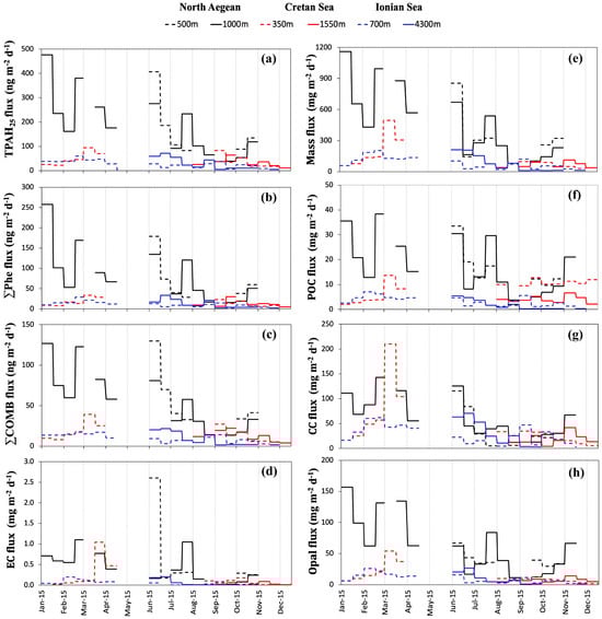 Time series of fluxes in the studied sites for (a) TPAH25; (b) ∑Phe; and (c) ∑COMB; (d) elemental carbon; (e) total mass; (f) particulate organic carbon; (g) carbonates and (h) opal, determined at corresponding sampling depths for the total study period. Fluxes E, G, and H data adapted from Nikolopoulou et al. (2024) [31] and Skampa et al. (2020) [35].