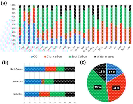 Overall, considering the above, the atmospheric deposition of char and soot carbon seem to constitute the most significant processes affecting the spatial variability of PAH fluxes in the studied sites, contributing on average 39% and 31%, respectively, followed by organic carbon flux (17%) and the influence of water masses circulation patterns (13%) (Figure 8c).