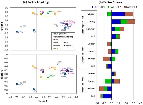 PCA results. (a) Factor loadings for environmental forcing, bulk properties, PAHs and lipid biomarkers for the collected sinking particles; (b) Plot of main factor scores for sinking particles identified for each station and season.