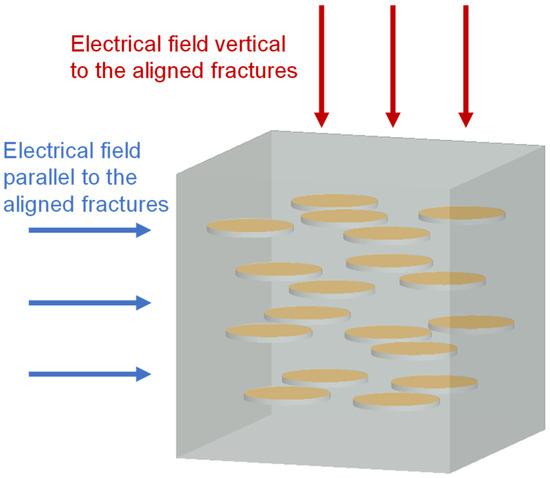 Great efforts have been made to obtain the knowledge of electromagnetic responses in hydrate-bearing reservoirs [6,7,8,9], which is the key to accurately invert the electromagnetic survey data. The obtained knowledge reveals that the increasing hydrate saturation can decrease the conductivity and relative permittivity of porous media, and their decreasing trends are dependent on hydrate distribution (i.e., morphology) [6,7]. For example, the cementing or bridging hydrate can more significantly reduce the above two properties than the floating hydrate [8,10]. On the other hand, the electromagnetic properties are highly related to their detecting frequency. The existing studies show that the conductivity and relative permittivity of porous media containing hydrate continuously increases and decreases on the whole with enhancing frequency, respectively, although their change amplitudes are distinct at different frequency ranges [6,11,12]. Such knowledge of electromagnetic properties has been employed to evaluate hydrate resources in porous reservoirs with great success. However, the mentioned knowledge is gained based on isotropic media, because the corresponding studies mainly focus on the isotropic pore-filling hydrate reservoirs. As a result, the above knowledge is not applicable to assessing the fracture-filling hydrate reservoirs [13,14]. Because fractures commonly align along the prior direction caused by the effects of tectonic movement or stress orientation [15,16], resulting in the electromagnetic properties of such reservoirs showing dramatic anisotropy [17,18].