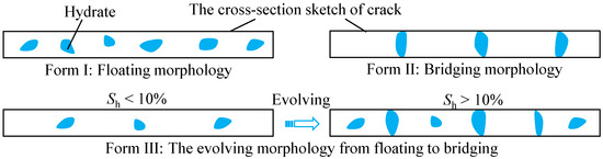 Then, we, respectively, insert the particular pixel cluster representing different hydrate distributions with varying saturations into the aligned cracks via Image J, to construct a series of fracture-filling hydrate digital cores. Given the experimental insights into the evolution of hydrate distribution in fractures [21,22], the hydrate distribution (i.e., hydrate morphology) in fractures can be classified as floating and bridging morphologies, and the hydrate with floating morphology can evolve to bridging morphology with increasing content of the hydrate. Specifically, the floating hydrate is not in contact with the grains inlaid in the surfaces of the cracks, while the hydrate with bridging morphology simultaneously contacts with the top and bottom surfaces of the cracks. Therefore, we scheme three forms of hydrate morphology in the cracks (as shown schematically in Figure 2), which are floating morphology, bridging morphology, and evolving morphology (i.e., the floating morphology gradually transforms to the bridging morphology as saturation is higher than approximate 10 percent). Each hydrate morphology contains multiple hydrate saturations.
