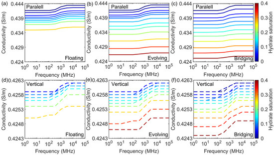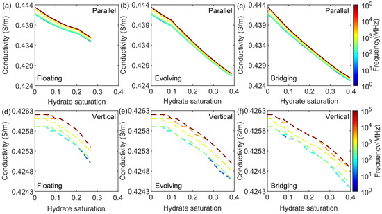 Figure 3 presents the changes in the simulated anisotropic conductivities in the digital cores with cracks containing various hydrate morphologies as functions of frequency at varying hydrate saturations. In Figure 3, the anisotropic conductivities for the different morphologies and saturations enhance on the whole with elevating frequency. This is similar to the reported experimental and simulated results based on the rocks with fractures [26,29]. The increase in conductivity with frequency lies in the fact that the digital cores are better polarized due to the oscillations of the electrical field at the lower frequencies, so that the rotation of charges needs to spend more energy resulting in the less transportation of the charges (i.e., the digital cores are less conductive). As the frequency continues to increase, the polarization would be continually weakened making the charges more active, which in turn gives rise to the enhancement in the conductivity of the digital cores [29]. In particular, the apparent conductivity dispersion at the frequency range roughly between 100 MHz and 3 GHz, as shown in Figure 3, indicates that the interfacial polarization due to the build-up of charges on the interfaces between the components (i.e., background, brine, as well as hydrate) with various electrical properties at this frequency range can significantly affect the conductive ability of the fracture-filling hydrate digital cores.