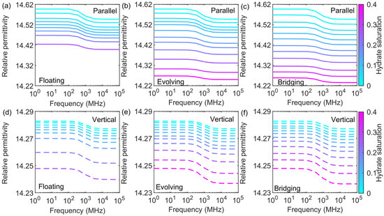 The changes in the simulated anisotropic relative permittivities of the fractured digital cores with various hydrate distributions as functions of frequency at varying hydrate saturations are presented in Figure 5. Contrary to the changes in the simulated anisotropic conductivities with increasing frequency, the relative permittivities of the several hydrate distributions decline with the raising frequency at each saturation. The above phenomenon is understandable because the electrical polarization of the digital cores is strengthened at the lower frequencies due to the oscillations of the electrical field, giving rise to the bigger relative permittivity [29]. However, the digital cores are worse polarized at the higher frequency range caused by the frequent change in the electrical field, which in turn leads to the continual decrease in the relative permittivity [29]. Apart from the overall decline of the relative permittivities with frequency, Figure 5 also shows that the declining trend at the frequency range roughly between 100 MHz and 3 GHz is observably steeper than that at other frequency ranges. The frequency range between 100 MHz and 3 GHz, where the relative permittivities change with a larger extent, is consistent with the frequency range for the notable variation in the simulated conductivities (see Figure 3). Such dielectric dispersion further highlights the importance of the effects of the interfacial polarization on the electromagnetic properties (including conductivity and permittivity) at this frequency range.