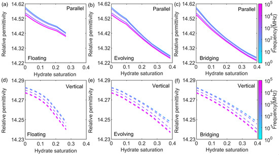 Similarly to the difference in the changes between the anisotropic conductivity dispersion magnitudes with increasing hydrate saturation (see Figure 3), the relative permittivity dispersion magnitude that is calculated by the relative permittivities at the low- and the high-frequency limits decreases with increasing hydrate saturation in the direction identical to the cracks but increases in the perpendicular direction, as given in Figure 5. As has been noted, the anisotropic variations in the relative permittivity dispersion magnitude can also be attributed to the integrated effects of alignment of fractures, relative permittivity of the hydrate, and interfacial polarization. This further demonstrates that the dispersion characteristic and anisotropy of electromagnetic properties are valued and should be simultaneously considered in the evaluation of fracture-filling hydrate reservoirs. Another similar anisotropic behavior to the conductivity is that the relative permittivities in the direction along the fractures for all hydrate distributions at the same frequency and saturation are evidently higher than that in the other direction, as presented in Figure 5. The intrinsic anisotropy of the digital cores induced by the oriented cracks could also explain the above difference. Because the diameter of the penny-shaped fractures is dramatically larger than their thickness, the aligned fractures containing brine can provide more charges to gather on the surfaces between the various components when the electrical field is parallel to the fractures, resulting in the stronger interfacial polarization (i.e., the higher relative permittivity). Instead, as an electrical field is operated on the digital cores in the perpendicular direction relative to the cracks, the interfacial polarization is weaker owing to the less accumulation of charges in the fractures in their vertical direction (hence the lower relative permittivity).