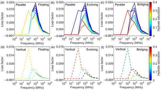 This study has presented and interpreted the frequency-dependent anisotropic conductivities and relative permittivities of the cores with cracks including various hydrate distributions with varying saturations in the previous two sections. The dielectric loss factor, as another important electromagnetic parameter, is also frequency-dependent and anisotropic, as illustrated in Figure 7. It is shown that the loss factors for the three hydrate distributions all first enhance and then reduce with the elevating frequency. Additionally, it could also be discovered that most of the characteristic frequencies (i.e., the frequency of the loss factor peak value) are approximately 1000 MHz, and the peak values of loss factor in the parallel direction relative to the fractures at this frequency decline overall with the increasing hydrate saturation, while there is unclear changing trend in the loss factor peak value vertical to the fractures with hydrate content.