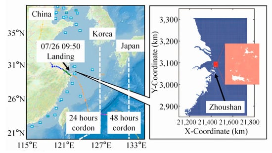 This section first describes the characteristics of Typhoon In-fa (No. 2106) (for consistency, this study will hereafter refer to this event as Typhoon 2106), followed by a comprehensive overview of the storm surge model used, Delft3D. Detailed explanations of experimental design and data sources are also provided. Typhoon 2106 originated in the western Pacific on 18 July 2021, at 2:00 AM (Beijing Time, UTC + 8) at 132.5° E, 22.2° N. (All subsequent times are reported in (Beijing Time, UTC + 8) unless otherwise stated.) By 5:00 PM on 21 July, the typhoon had crossed the 24-hour warning line, approaching the Zhoushan Islands. Typhoon 2106 ultimately made landfall in Zhoushan City, Zhejiang Province, China at approximately 9:50 AM on July 26 (as shown in Figure 1), before moving northward and dissipating in the Bohai Bay []. According to the China Meteorological Administration’s final path report, Typhoon 2106 struck Zhoushan with a wind speed of 38 m/s and an atmospheric pressure of 968 hPa, marking it as one of the most intense typhoons in the region since 1949. This study selected typhoon 2106 as a critical case for storm surge modeling due to its extreme intensity, with numerical simulations conducted to capture surge dynamics under the specific wind field conditions of this landmark event.