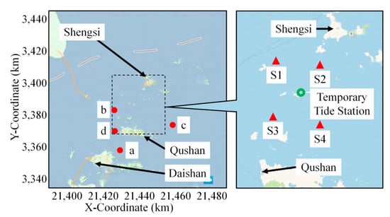 The cable scour protection requires special attention, so four characteristic sea areas near the Daishan Island are selected: (a)strait, (b) bypassing area, (c) open sea area, and (d) sheltered area, as shown in Figure 2.