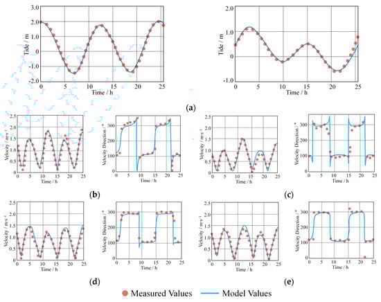 Verification of flow velocity and direction during the high tide period. (a) Temporary sea-surface station astronomical tide verification; (b) S1 site; (c) S2 site; (d) S3 site; (e) S4 site.