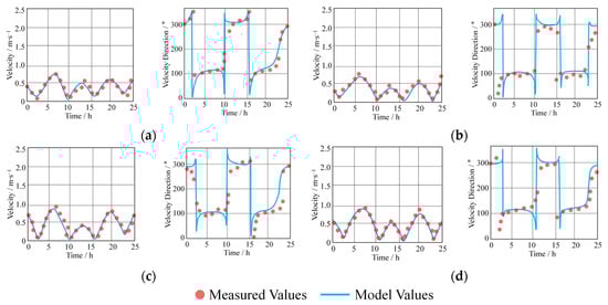 Verification of flow velocity and direction during the neap tide period. (a) S1 site; (b) S2 site; (c) S3 site; (d) S4 site.