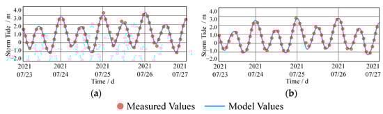 Verification of sea surface elevation during Typhoon 2106. (a) Qushan Station; (b) Sijiao Station.