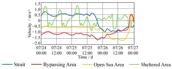 The simulation covers a 72 h period from 00:00 on July 24 to 00:00 on July 27. Since the model uses a cold start, the simulation data begin at 00:00 on July 24. The Delft3D model outputs primarily include ocean currents (flow velocity) represented by x- and y-directional components. Additionally, atmospheric pressure and wind speed are critical input parameters that influence the simulation. These are provided in the Supplementary Materials (Figure S1a,b). To obtain the true simulation values, the vector sum of these components is calculated, as shown in Figure 6. The details of x- and y-directional flow velocity components can be found in the Supplementary Materials (Figure S1a,b).