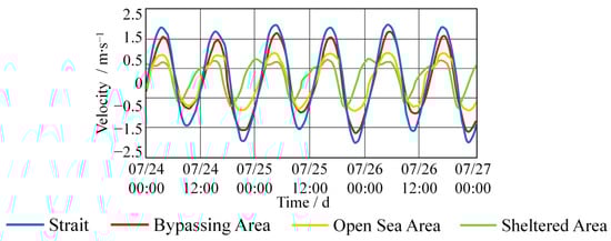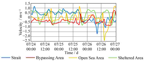 This section simulates the flow velocity fields resulting purely from astronomical tides and storm surges, exploring the variations in vertically averaged flow velocity data in the study area during Typhoon 2106. These simulations provide the preliminary conditions for analyzing the nonlinear interactions between astronomical tides and storm surges. Typhoon 2106 made landfall on Zhoushan Island at approximately 9:50 a.m. on July 26, having reached the boundary of the study area around 4:00 PM on July 25. Four characteristic locations near Daishan Island were selected for the study: the strait (a), bypassing area (b), open sea area (c), and sheltered area (d), as shown in Figure 2.