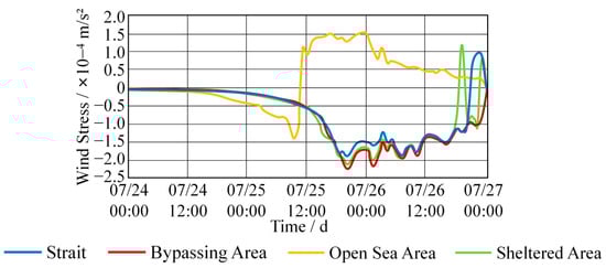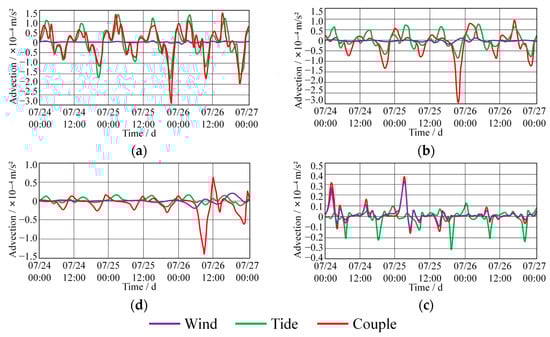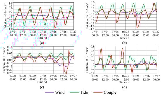 Whether it is bottom friction, wind stress, or the convective term, all are calculated as vector quantities based on their x- and y-direction components. As outlined in Equations (7) and (9) and “Section 4.1.3”, these represent the calculation methods for the magnitudes of the vector sums of the three nonlinear terms. The overall vector direction is determined by the distribution of the original x-direction components. If the x-direction component is positive, the resultant vector sum is positive, indicating an overall vector direction toward the east; conversely, if the x-direction component is negative, the resultant vector sum is negative, indicating an overall vector direction toward the west.