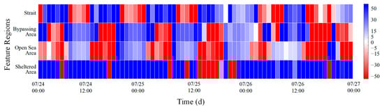The bypassing area and strait exhibit similar periodic patterns. The differences in geographic location result in different phases of nonlinear increase and decrease occurring at the same time in these two regions. However, the frequency of “nonlinear decrease” in the bypassing area is higher than in the strait, with a complete cycle of approximately 12 h, consisting of 8 h of a “nonlinear decrease” followed by 4 h of a “nonlinear increase.” This suggests a distinct rhythmic pattern in the coupling effects of flow velocity in these regions.