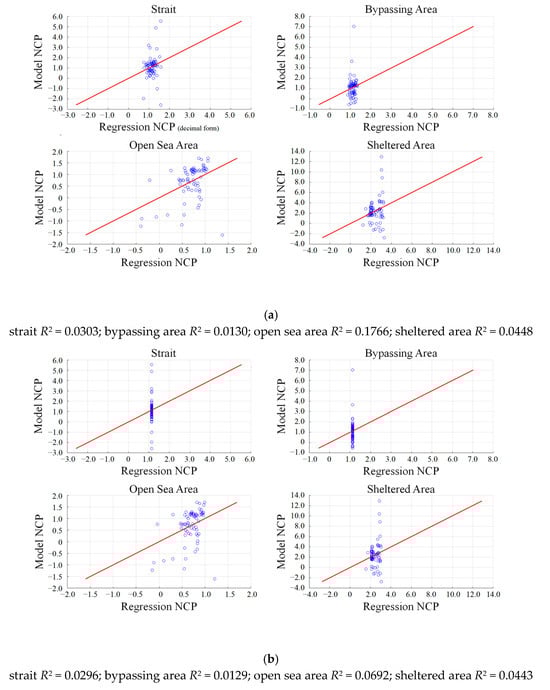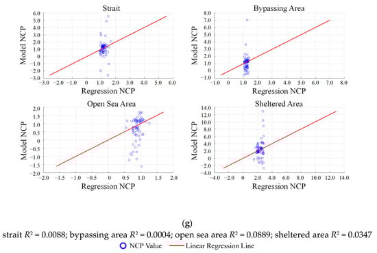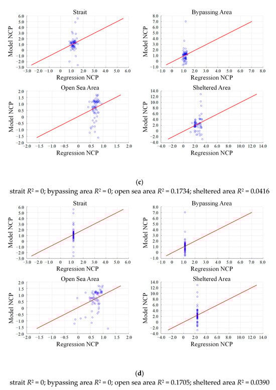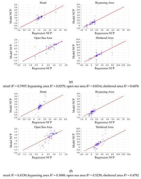 The regression analyses aimed to quantify the contributions of wind stress, convection, and bottom friction to NCP. As expected, wind stress dominated in open sea areas due to the absence of topographical constraints, while convection emerged as the primary driver in straits and bypassing zones, reflecting the concentrated flow and increased turbulence in these regions. Although bottom friction exhibited the least influence overall, its impact was amplified in shallower regions, consistent with theoretical expectations [,]. These findings align well with prior studies of storm surge dynamics, reinforcing the robustness of the regression model’s outcomes. The scatter plots of NCP (Figure 13) and the corresponding goodness-of-fit R2 values were obtained for each model.